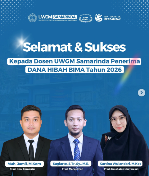 Selamat dan Apresiasi kepada Dosen UWGM Samarinda penerima Bantuan Hibah BIMA Tahun 2026. 15 Apr 2026 Admin Selamat dan Apresiasi kepada Dosen UWGM Samarinda penerima Bantuan Hibah BIMA Tahun 2026.Dosen : Sugiarto, S.Tr., Sy.,M.E (Prodi Manajemen)