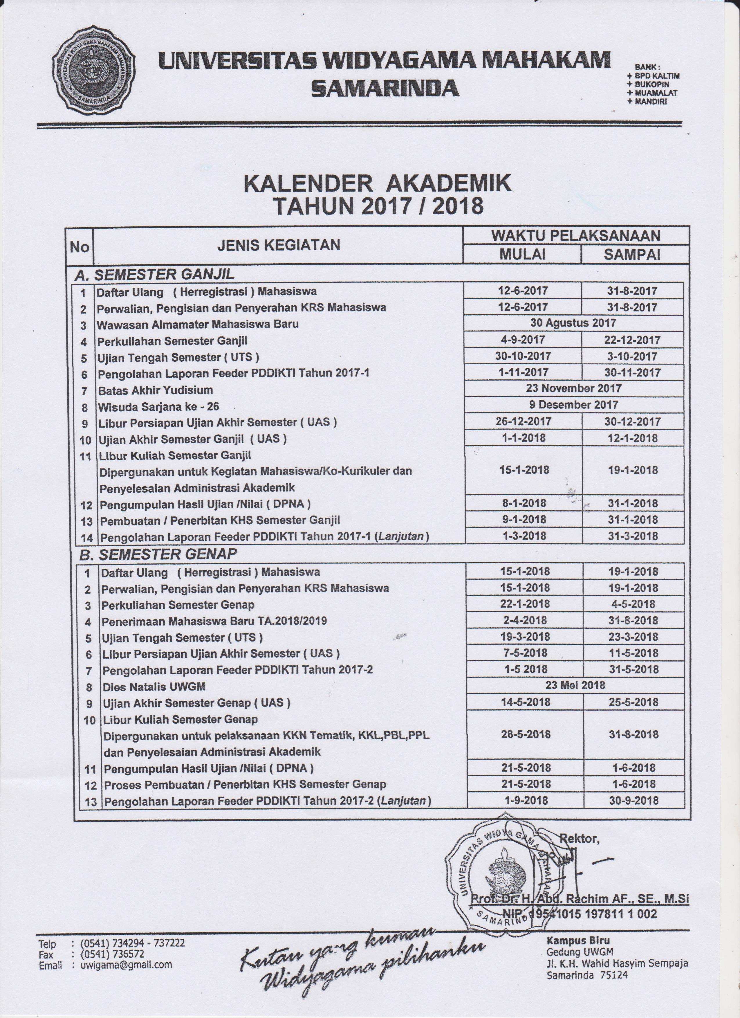 Diberitahukan kepada seluruh mahasiswa Fakultas Ekonomi UWGM; berdasarkan Kalender Akademik TA. 2017/2018 bahwa perkuliahan semester Ganjil akan dimulai pada tanggal 4 September s/d 22 Desember 2017. Pembayaran SPP, Perwalian, Pengisian dan Penyerahan KRS dimulai tanggal 12 Juni s/d 31 Agustus 2017. Jika ada perubahan tanggal pelaksanaan akan diinformasikan selanjutnya.