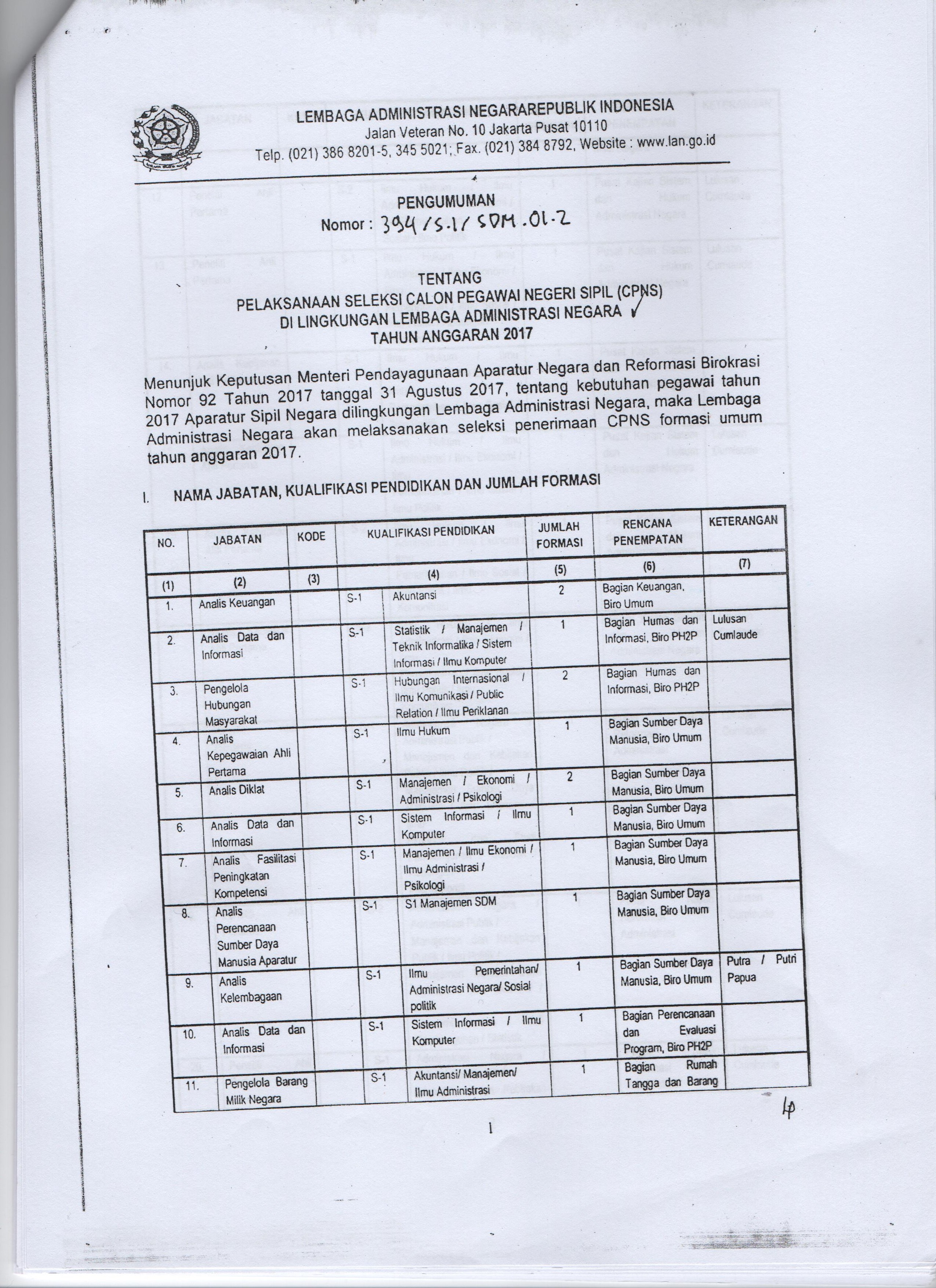 Dengan ini kami sampaikan Pengumuman Sekretaris Utama Lembaga Administrasi Negara Nomor 394/S.1/SDM.01.2 tanggal 05 September 2017 Tentang Pelaksanaan Seleksi Calon Pegawai Negeri Sipil (CPNS) Di LIngkungan Lembaga Administrasi Negara Tahun Anggaran 2017, dimana didalamnya terdapat lowongan penerimaan CPNS untuk PKP2A III LAN yang bertempat di Samarinda.