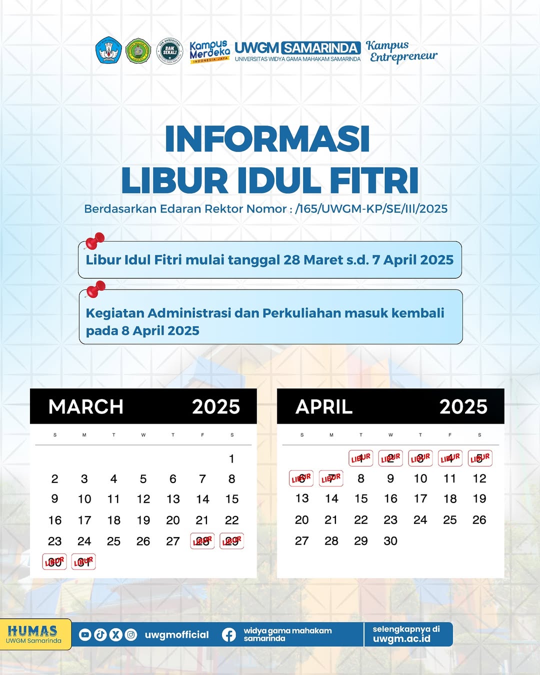 INFORMASI LIBUR IFUL FITRI 1446 H 24 Feb 2025 Admin INFORMASI LIBUR IFUL FITRI 1446 HLibur mulai 28 Maret 2025 s.d. 7 April 2025Masuk kembali pada 8 April 2025