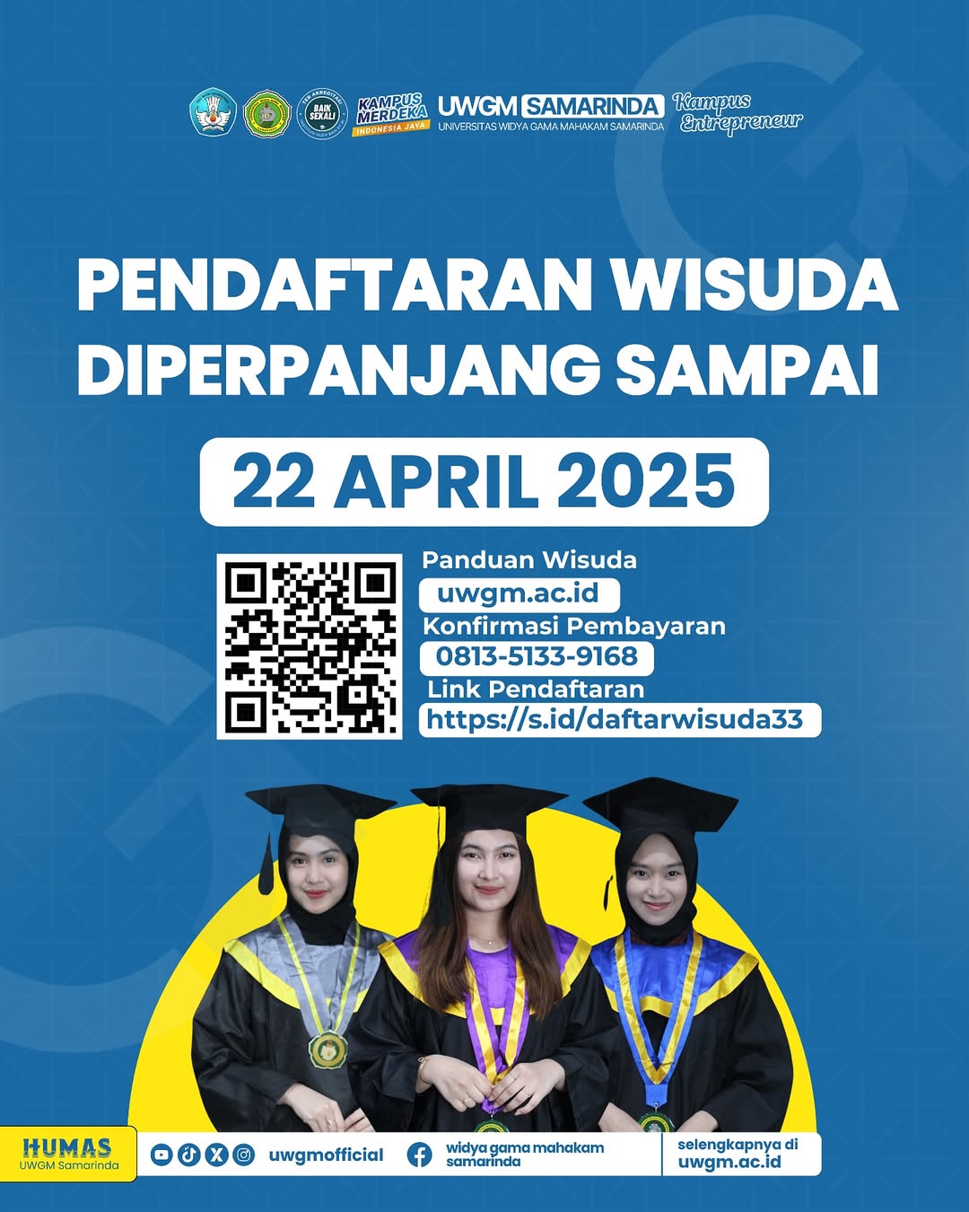 Pendaftaran WISUDA ke 33 UWGM Samarinda 17 Apr 2025 Admin Pendaftaran WISUDA ke 33 UWGM Samarinda diperpanjang sampai 22 April 2025 silahkan bagi yang belum mendaftar masih ada waktuu